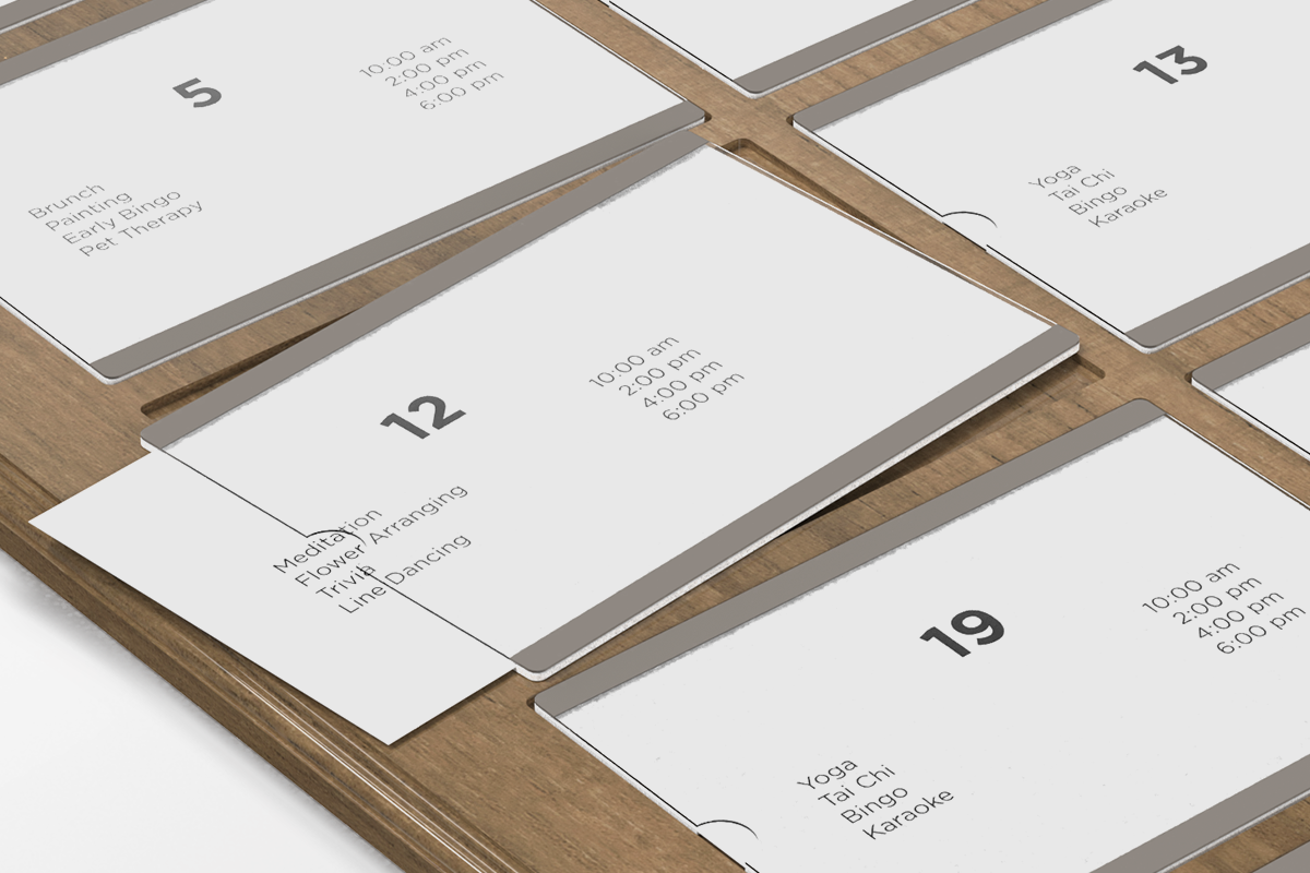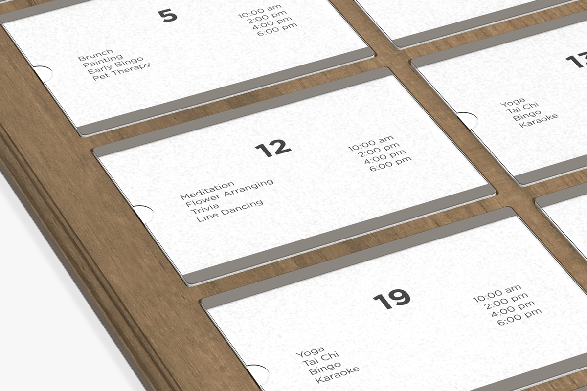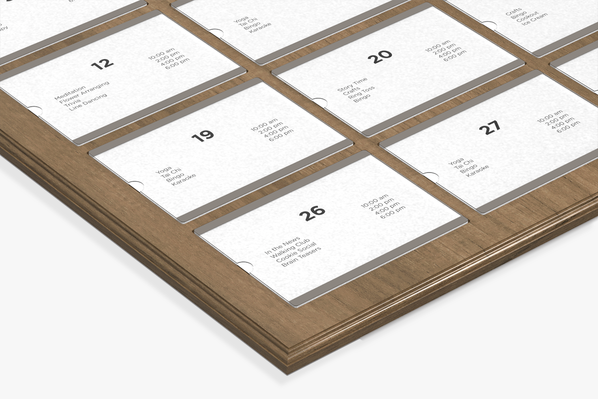 • Easy updating. Simply fold a printed 8.5" x 11" piece of paper in half and insert it in the slot designated for that day.